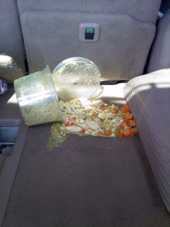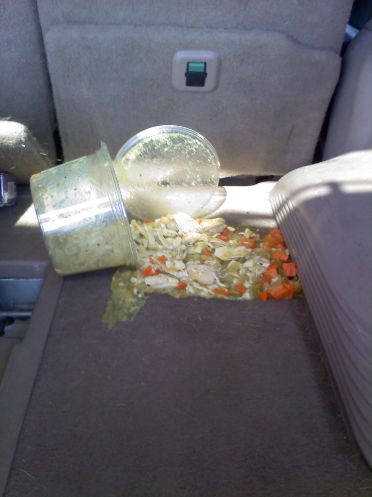When stupid silly things happen it is good to have a sense of humor. When the large family-sized container of chicken noodle soup you just bought at Costco tips over in the back of your car, the lid popping off, and all the chicken, noodles, onions and carrots spilling out onto the carpet–it is good to have a sense of humor, remain calm, laugh, and say “I can’t believe that happened.” Especially with little kids and little ears in the car.