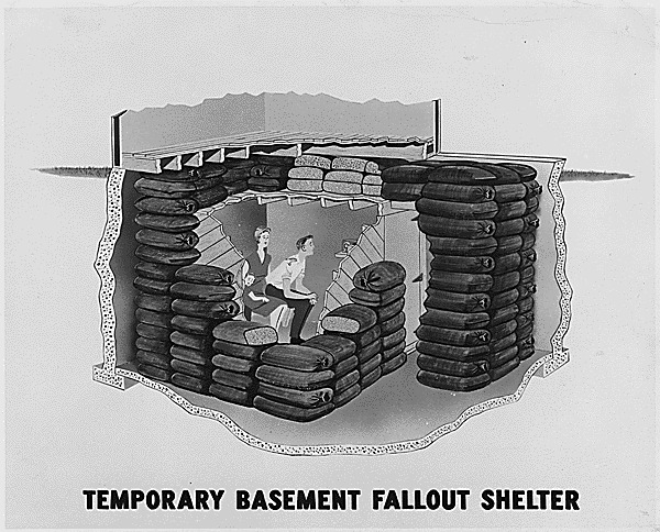 An artist’s rendition of a temporary basement fallout shelter, ca.1957.