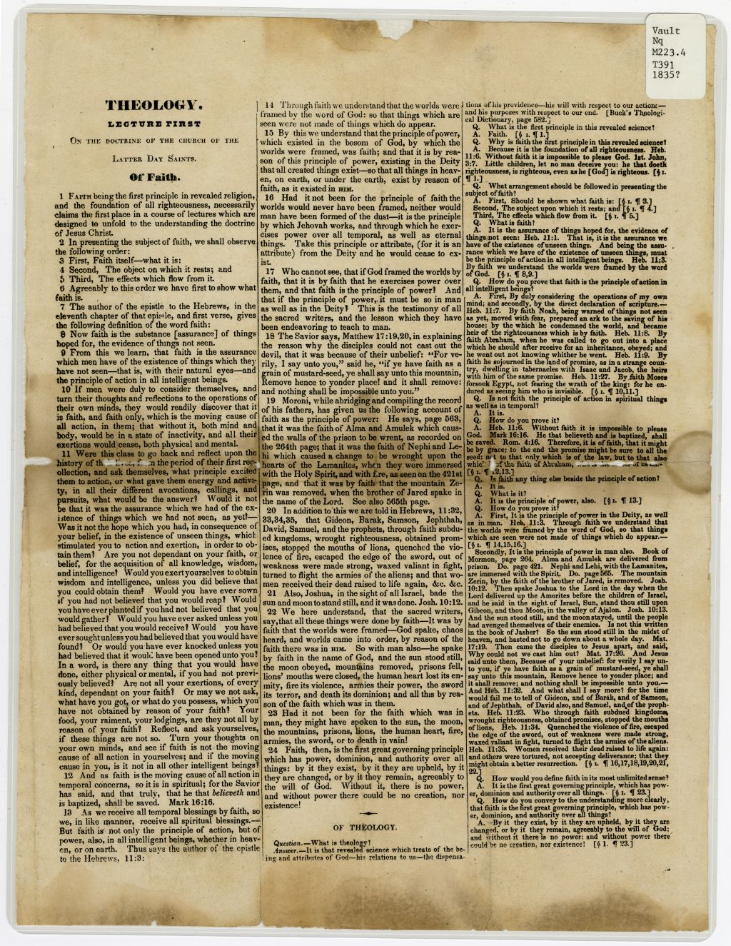 Sometime in the first months of 1835, the church’s printing office in Kirtland, Ohio, printed this broadside of a theological lecture “on the doctrine of the church of the Latter Day Saints.” The lecture was designated as the first in a series of several presentations on faith given at a theological school in Kirtland in the winter of 1834–1835.1 A June 1834 revelation declared that before church members could reclaim their lands in Jackson County, God’s people needed to “be taught more perfectly, and have experience and know more perfectly concerning their duty, and the things which I [God] require at their hands.”2 Thereafter, several of the “first Elders” in Missouri were appointed to travel to Kirtland to receive an endowment of power. Some of them were also told to assist in gathering the “strength of the Lord’s house” and in preaching the gospel so that Zion could be redeemed.3 As these elders began to reach Kirtland in fall 1834, JS and other leaders made “preperations for the school for the Elders, wherein they might be more perfectly instructed, in the great things of God during the coming winter.”4 The lectures were presented at this school and directed to elders who were preparing to proselytize, with the goal of “unfold[ing] to the understanding the doctrine of Jesus Christ.” They also provided instruction necessary for those who were preaching and gathering the elect to Zion, thereby facilitating the redemption of Zion. Such instruction prefaced an intense period of missionary work in 1835, when numerous men, including those newly designated as apostles or seventies, were sent from Kirtland to preach in the eastern United States and Canada.5