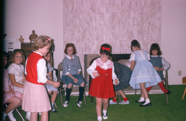 My mom threw me a party every year with friends and games. This was about 1964 — I recognize my two cousins and neighborhood friends. Those were the years that girls always wore dresses:
