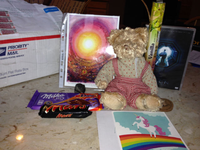 (yea, I collect them), incense (I’m a proud product of the ’60s), a teddy bear, a movie, a card, chocolate (my fav addiction), and a picture of the sun (