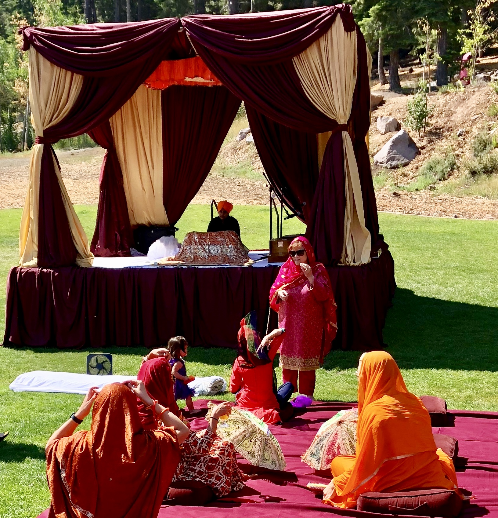 Next, all of the guests removed their shoes, covered their heads and sat on the floor on cushions — men on one side, women on the other. (Similar to LDS temples, and Jewish Synagogues during the Day of Atonement.) We were outdoors, but a tent and altar was set up for the holy book (Guru Granth Sahib), the head priest, and musicians. The groom and his family entered, bowed, and then the bride and her family entered and sat on the floor before the High Priest, who was saying prayers (I think, as it was in Punjab.)